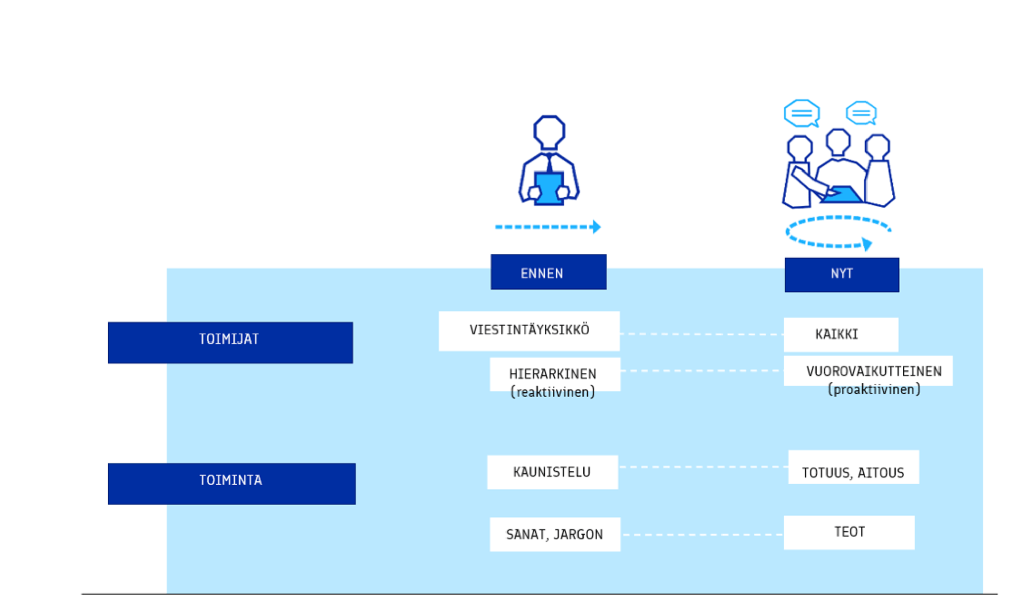 - Avoimuus: Keskeneräisistä asioista viestiminen on ihan ok! Kaiken ei tarvitse olla täydellistä.